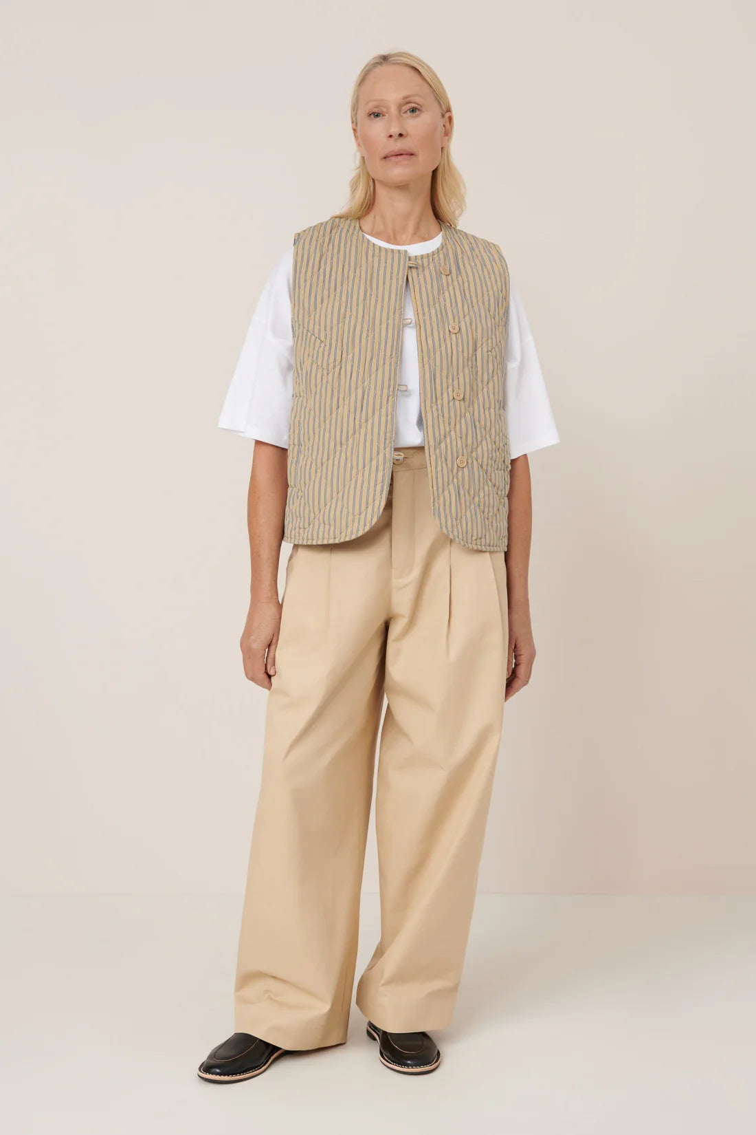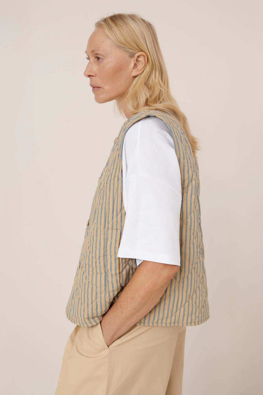 Inspired by traditional workwear, the Axis Vest is a lightweight quilted vest detailed with rouleau loops and nut buttons through the front. It has a standard fit, side pockets, an inner pocket and is designed to be layered over your favourite tee. Crafted from organic cotton poplin in a Double Pinstripe pattern and quilted with lightweight cotton wadding, it balances functionality with timeless style.