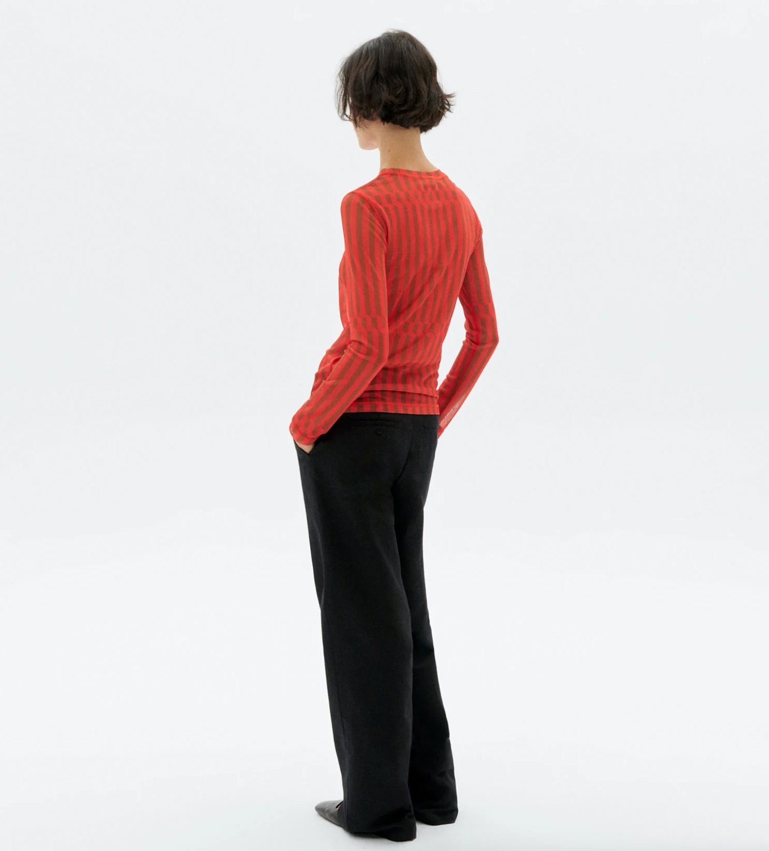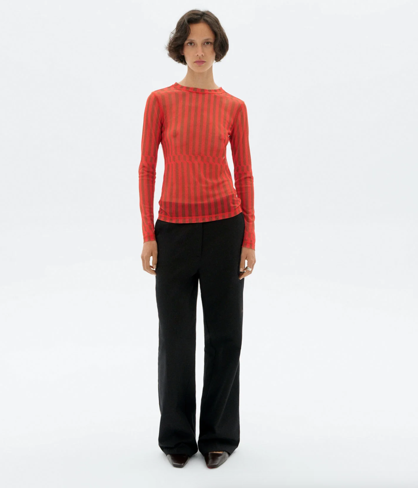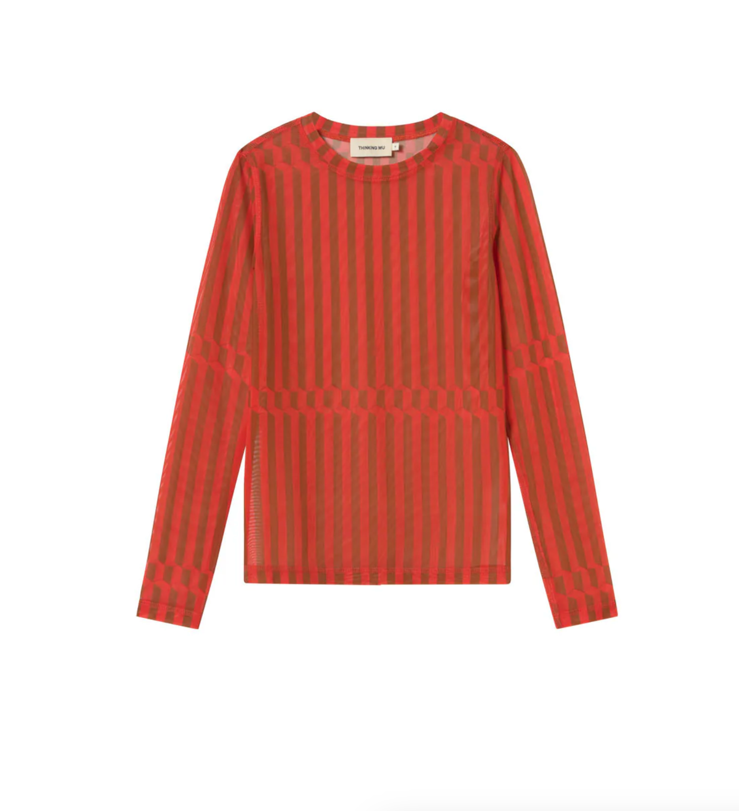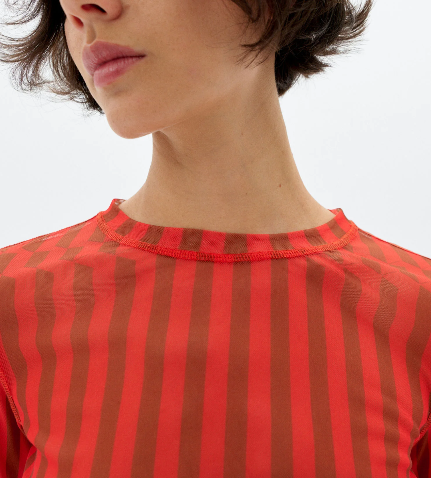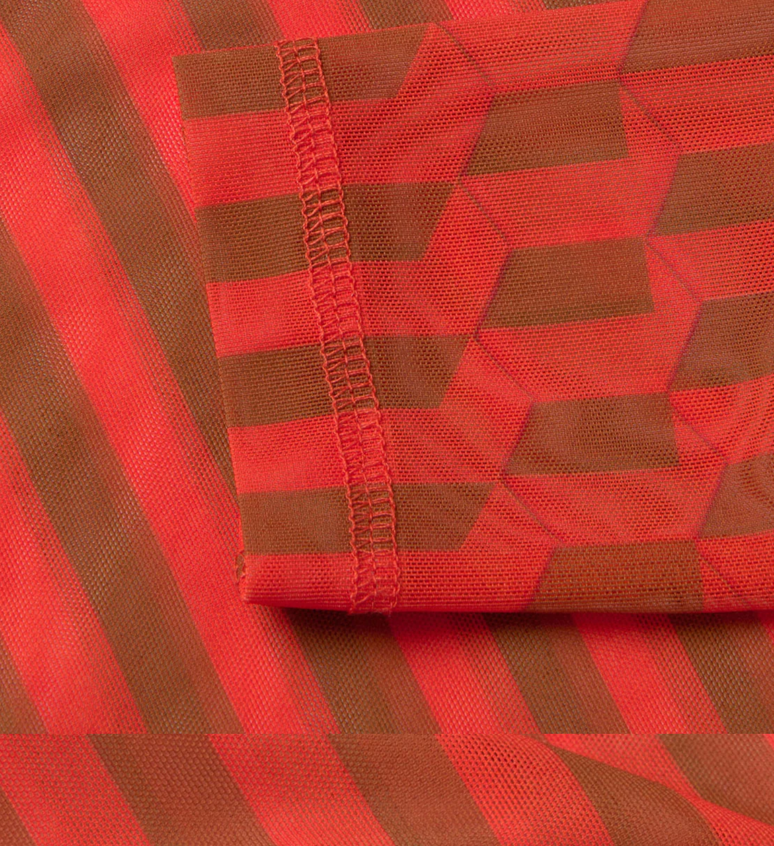 Orange Esqué Tere top made from recycled polyester, designed in collaboration with artist and designer Júlia Esqué, who has created different prints inspired by basketry and craftsmanship, using colored paper.