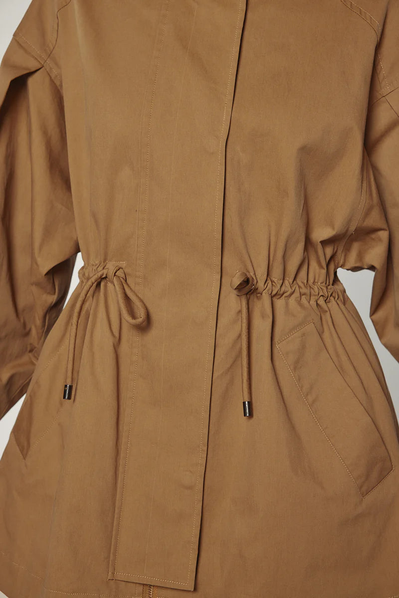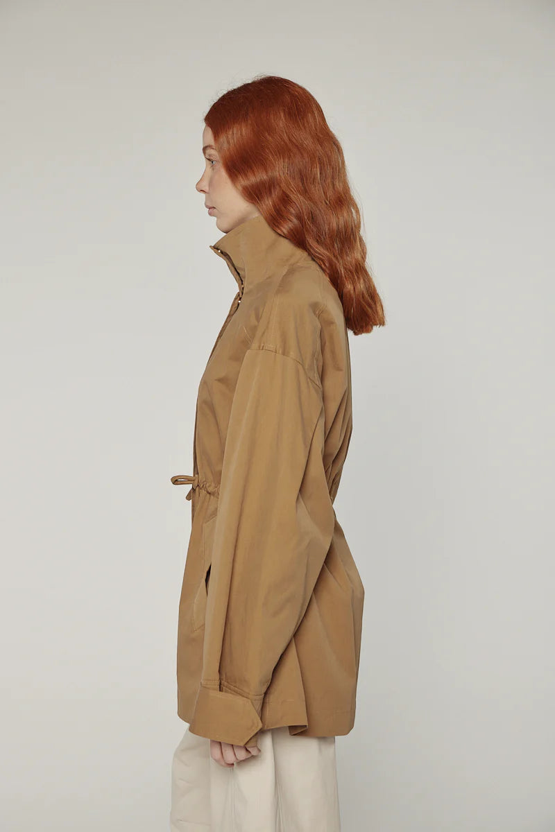 This utility-inspired jacket is crafted from a sturdy yet soft cotton blend, designed with clean lines and a relaxed fit. The adjustable waist tie allows for a customizable fit, while flap pockets and a hidden button placket add a utilitarian touch. Ideal for transitional layering.