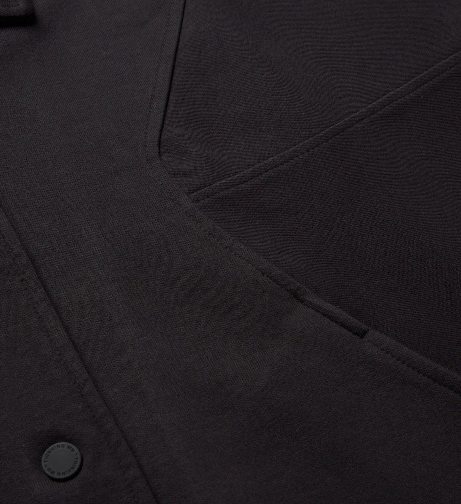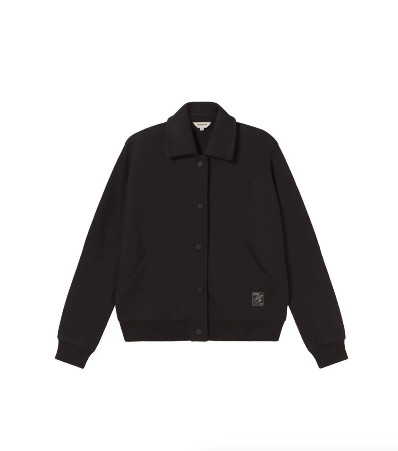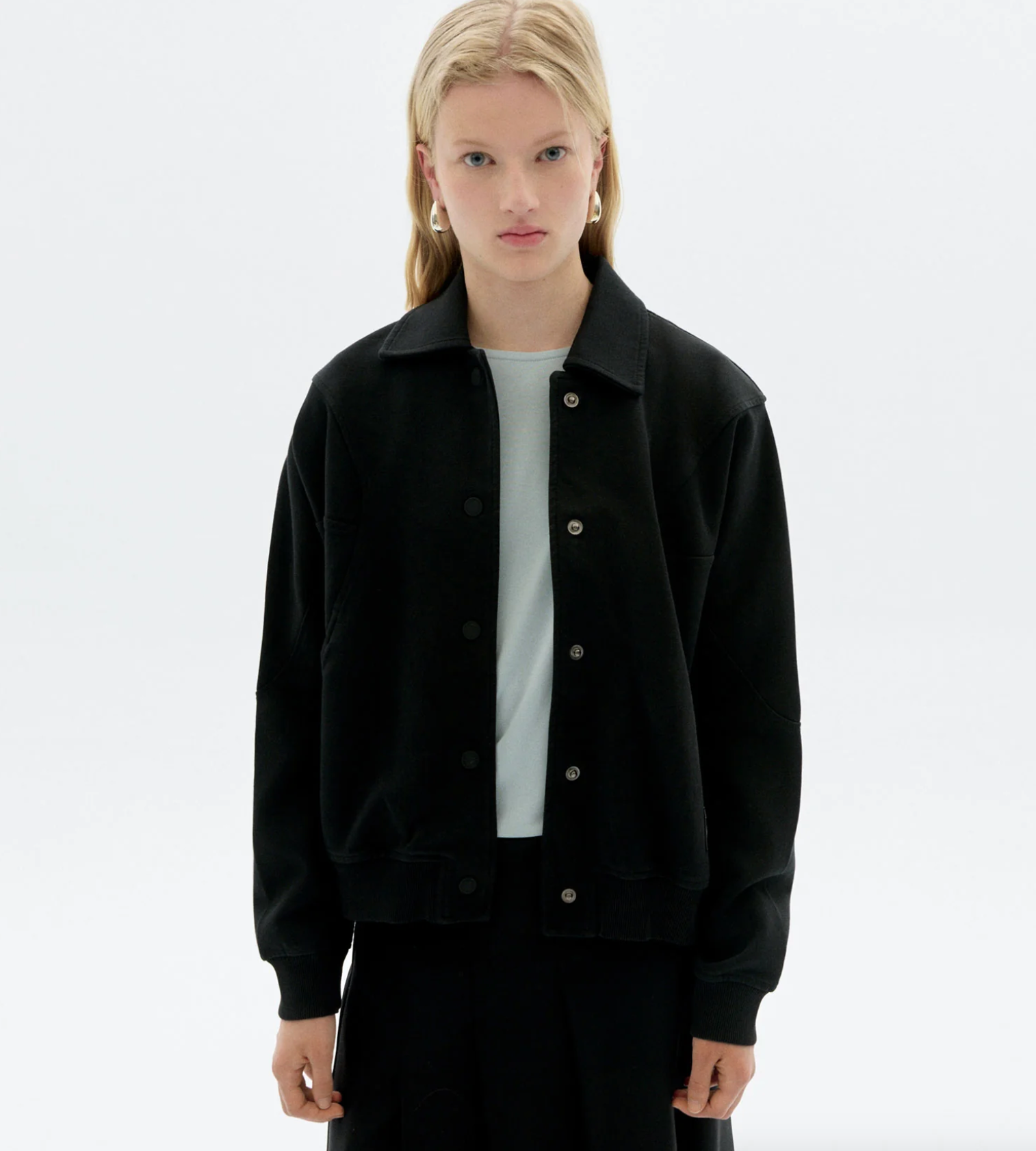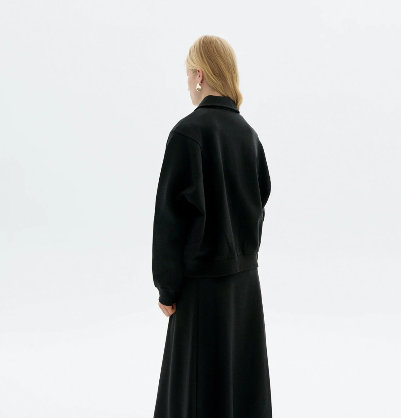Black Maisie jacket made of organic cotton. The sillouhette is so good in-person. I would descripe it as an oversized bomber jacket. Perfect weight to transition into cooler temps but GREAT to wear inside any time of the year.