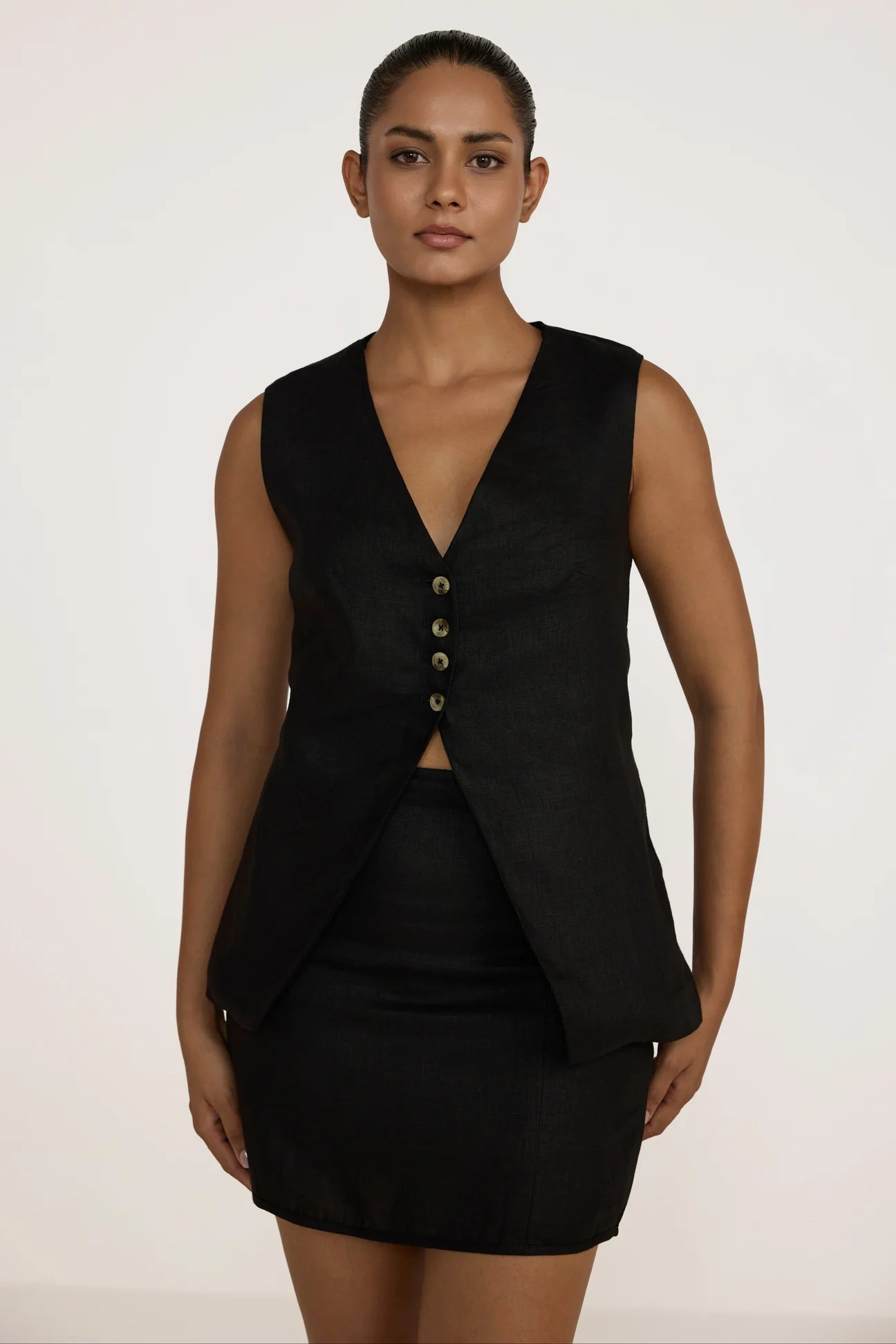 Timeless and tailored, the Classic Mini Skirt is crafted from a natural, undyed organic cotton-linen blend and accented with sleek black piping details for a modern edge. Designed with a fitted high waist and flattering pleats at the front and back, this skirt offers a polished silhouette that moves with ease. Perfect for pairing with your favorite tops, it’s a versatile staple for a refined, everyday look.