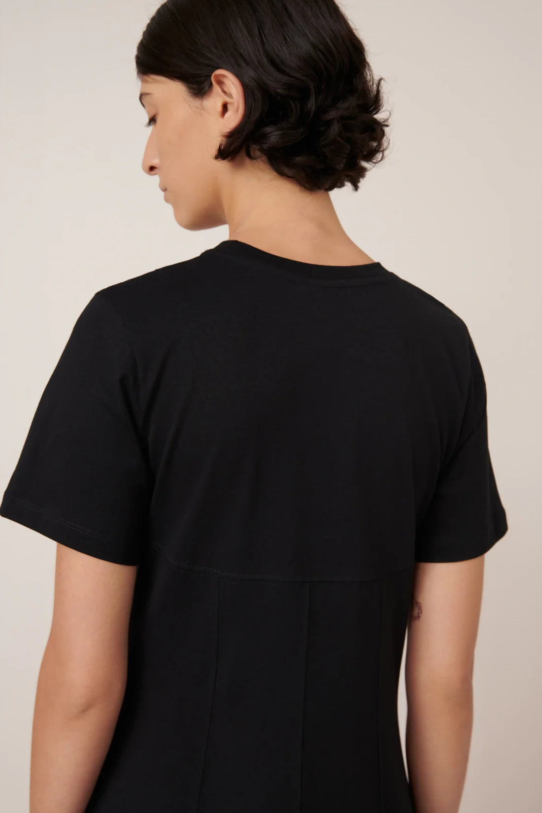 A simple tee dress with topstitched panel lines inspired by traditional corsetry. The Contour Dress features shoulder darts for subtle shaping and is made in a soft mid-weight organic cotton jersey. The dress has a standard fit and falls to midi length.