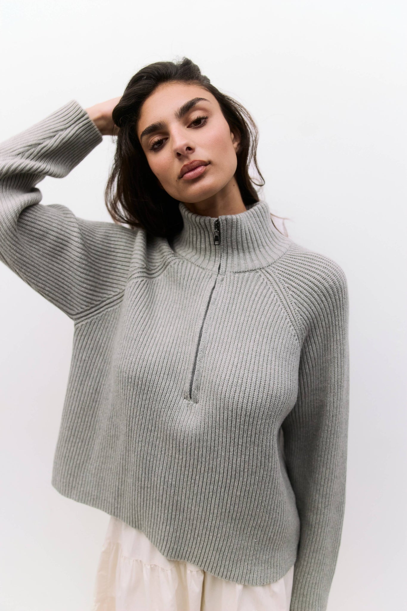 The Jules Sweater is a chunky ribbed knit designed with a relaxed fit and finished with a high turtleneck and partial front zip for versatile styling. With raglan long sleeves, it offers the perfect balance of structure and ease for cooler days.
