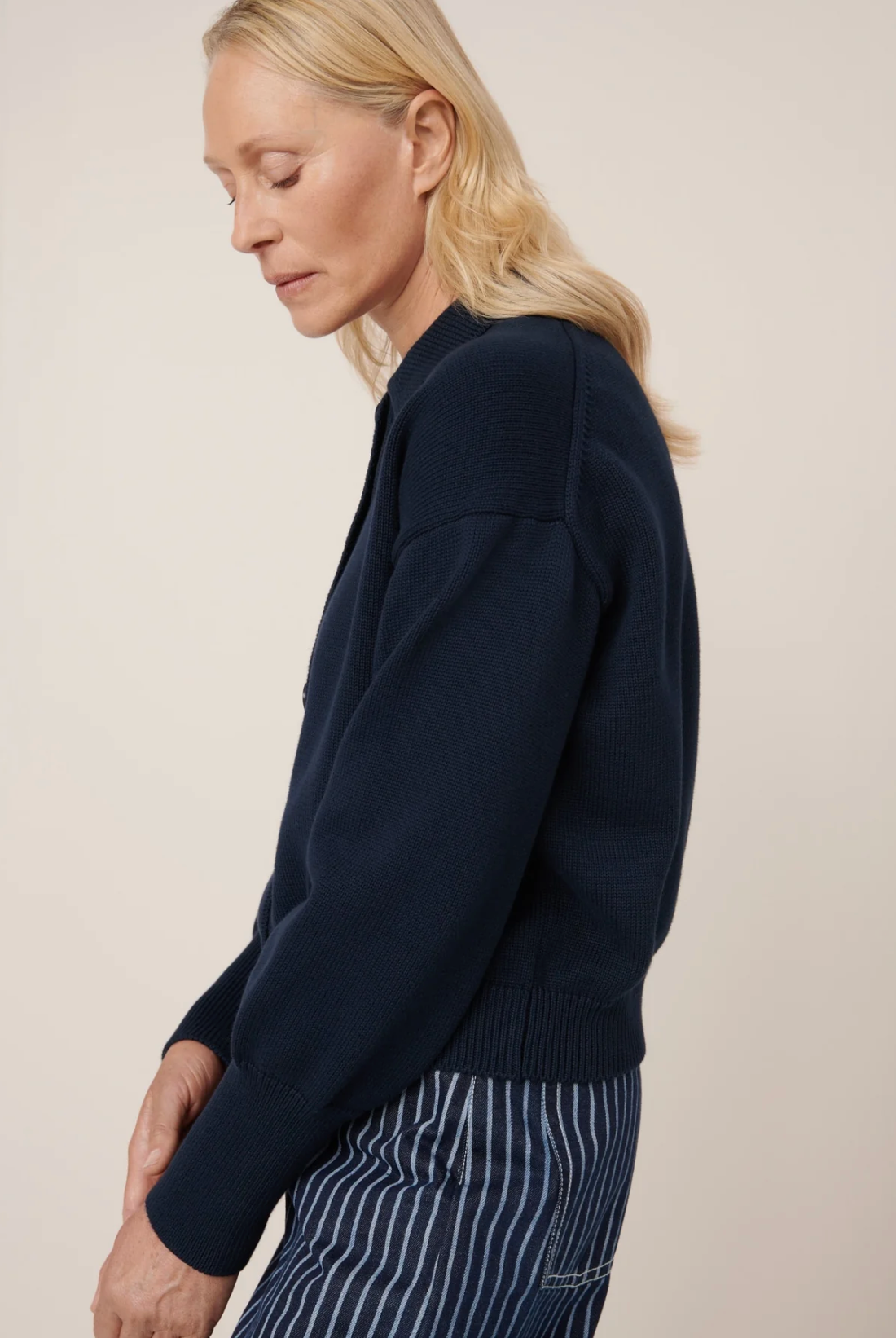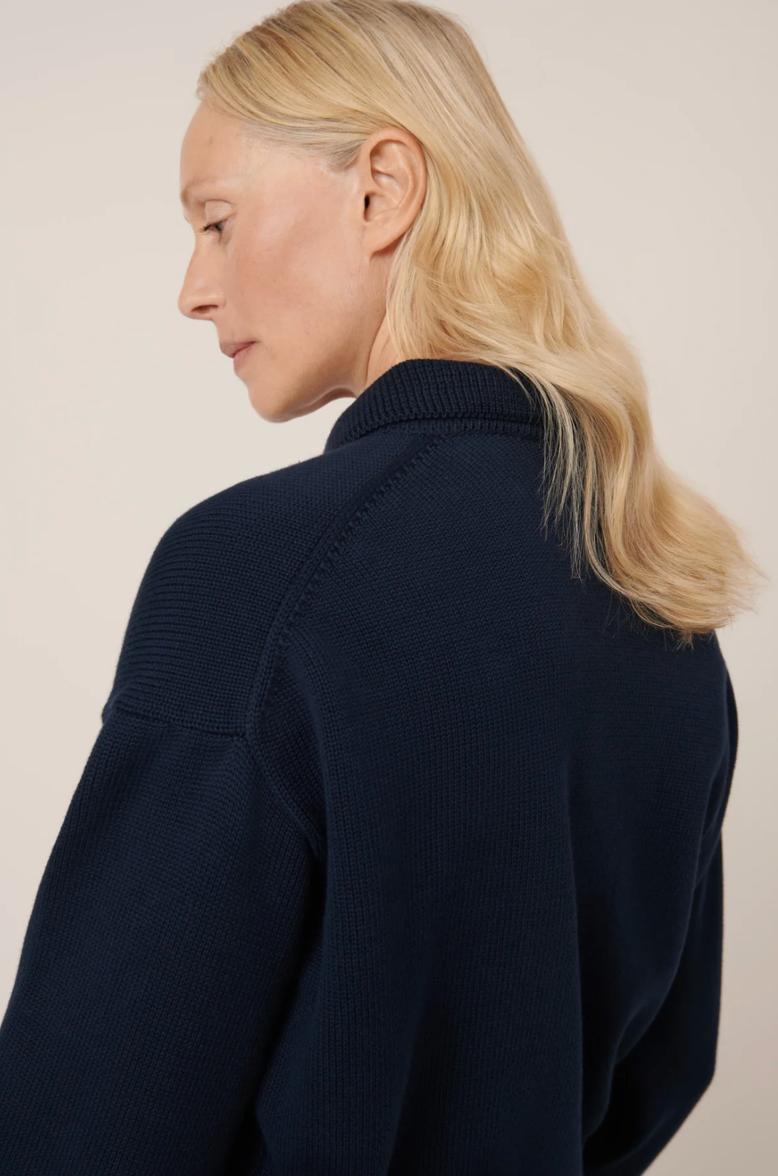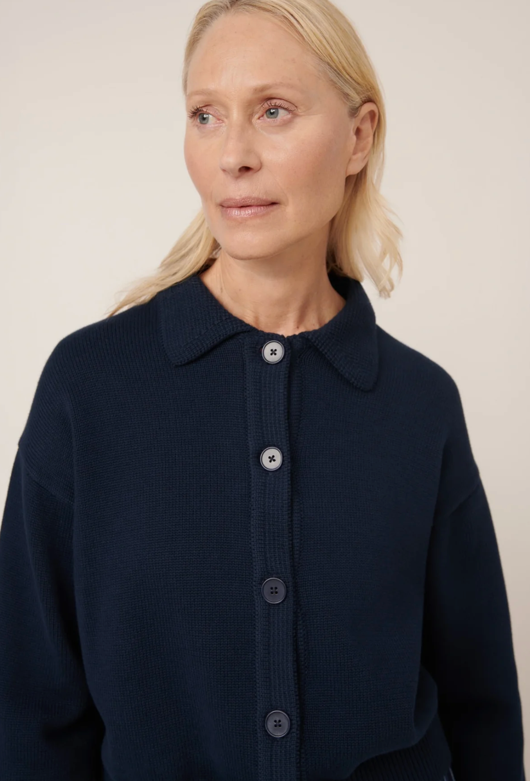 A refined take on the traditional cardigan, the Utility Cardigan features a boxy silhouette with a polo collar and sleek, elongated ribbed cuffs. It has a button-through front, finished with nut buttons and crafted from a soft organic cotton in a single jersey stitch.