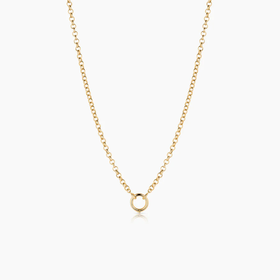 14k gold plated 3mm rolo chain necklace with center hinge opening for interchangeable charm styling. Available in multiple sizes.